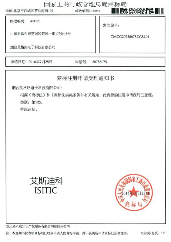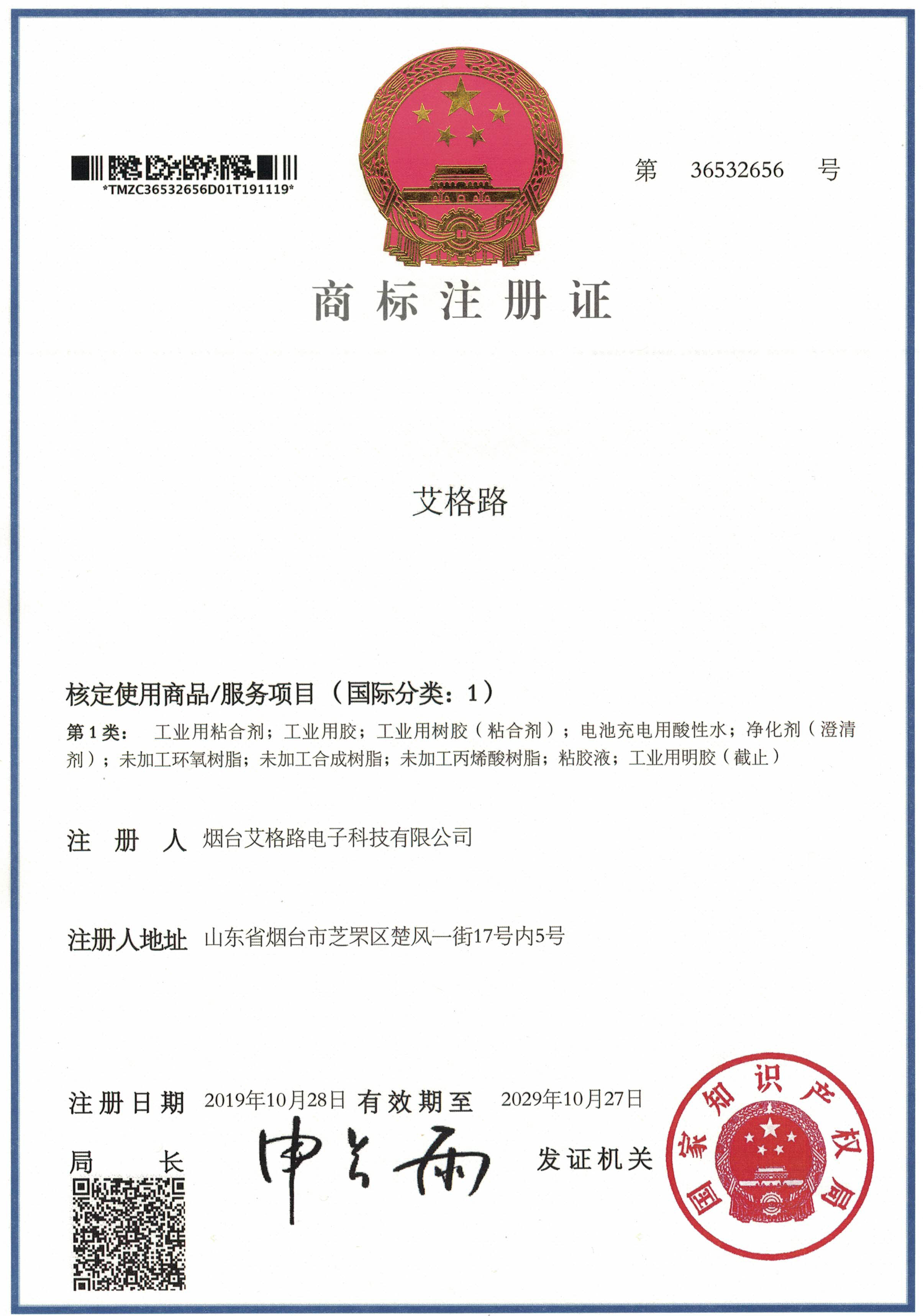 煙臺艾格路電子科技有限公司目前擁有四個注冊商標(biāo),分別是:艾格路?、艾斯迪科?,ISITIC?、tempbond?。艾格路解決方案和艾斯迪科品牌粘合劑期待著與您的溝通。